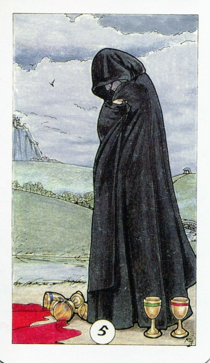 Но мы всегда можем изменить этот фокус. Именно об этой способности напоминает Пятёрка Кубков. Она словно задаёт вопрос: достаточно ли кверент силён — духовно и эмоционально, достаточно ли он зрел, чтобы понять, что именно он контролирует своё внимание, и только он способен его перенастроить? Ведь куда проще окутать себя чёрным плащом эмоций, дуться, прокручивать в голове свои несчастья и винить в них весь мир и людей вокруг. Это легко, но это лишь отговорка.
