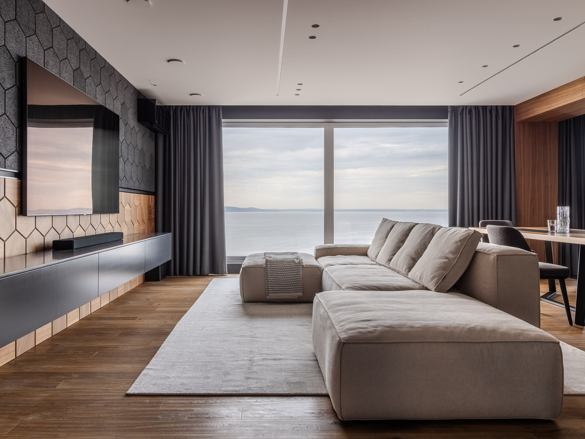 Несмотря на то, что помещение не маленькое — здесь 55 кв.м. — 12 из них уходит на прихожую и коридор. 1/3 часть мы отдали под кухонную зону. Плюс занимает место — обеденная группа. И для диванной зоны остаётся не так уж и много места. Поэтому мне визуально хотелось увеличить эту придиванную часть. Так на стене появились деревянные панели, которые как будто бы переходят с пола на стену. Форма этих панелей задана акустическими — мы повторили шестигранную форму. Акустические панели здесь не просто как декоративный элемент — они выполняют свою прямую задачу. Большая площадь остекления даёт вибрацию звука, и нужно эту вибрацию чем-то гасить. Здесь нам в помощь пришли как раз мягкие материалы и акустические панели. Так как кухня находится в общей зоне, нам не хотелось делать на ней акцент. Хотелось, чтобы она выглядела как архитектурный элемент. Вся функциональная часть расположена в нижних базах. Мы обрамили кухню деревянным порталом и повесили настенный акцентный длинный шкаф в шпоне. Таки