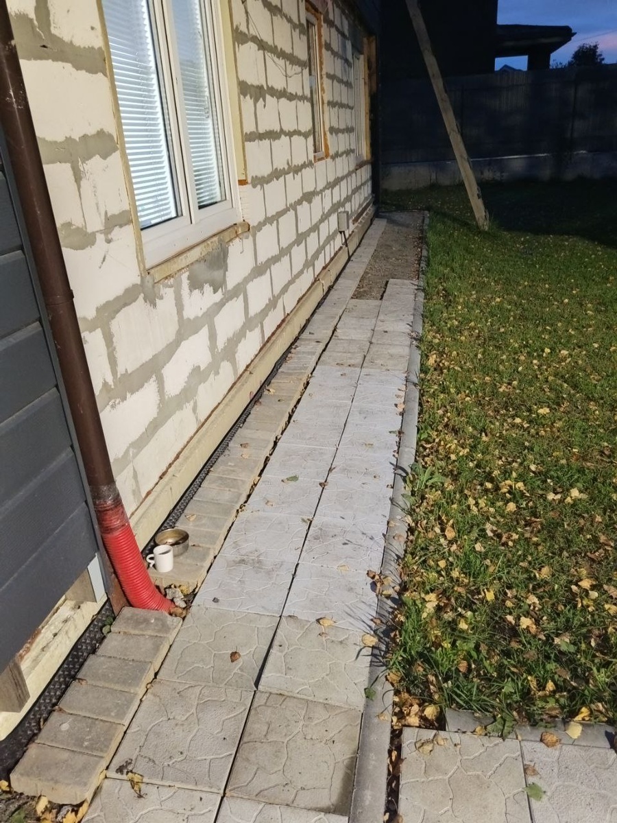 Уложил плитку "кирпичек" вдоль дома и отмостки