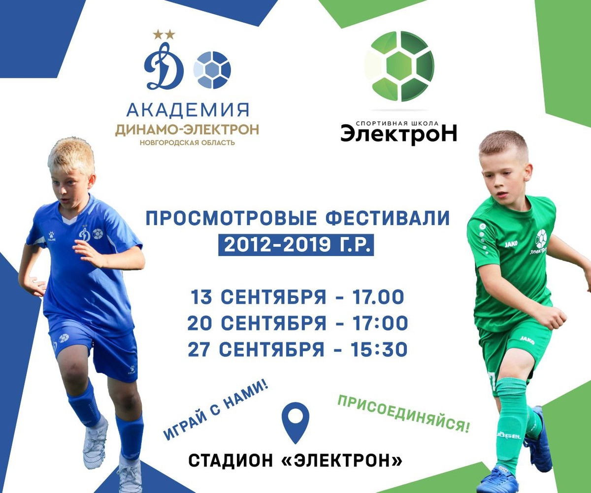 Внимание, юные футболисты! Спортивная школа «Электрон» и Академия «Динамо-Электрон» рады пригласить вас на просмотровые фестивали для мальчиков 2012–2019 годов рождения. В рамках фестивалей вас ждут увлекательные станции с интересными упражнениями и играми, которые помогут раскрыть ваш талант и стремление к развитию. Не упустите эту возможность! Не медлите, регистрация уже открыта! Перейдите по ссылке 👇https://clck.ru/3P9Nk6 чтобы зарегистрироваться заранее. 💚💙