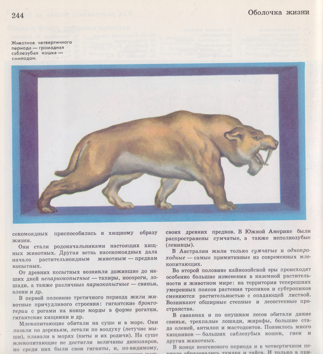 Я шёл и слушал его тогда затаив дыхание. Перед моим воображением открывался совсем иной мир, полный невероятных чудес. Проходя мимо строящихся гаражей, мимо пятой школы и пятиэтажных "хрущевок" я пытался представить себе, как весь этот постсоветский индустриальный пейзаж исчезает и на его месте появляются и отходят льды, как шерстистые мамонты сменились гигантскими слонами и носорогами, как стада южных антилоп несутся по степям. Да и степи уже сменяются густыми тропическими лесами, а наши предки все сильнее и сильнее похожи на обезьян, у которых искусно выполненные копья и стрелы из мамонтовой кости сменились грубыми каменными резцами и деревянными дубинами. Где наш предок был не столько охотник, сколько жертва. Ведь на наших предков охотились саблезубые кошки.