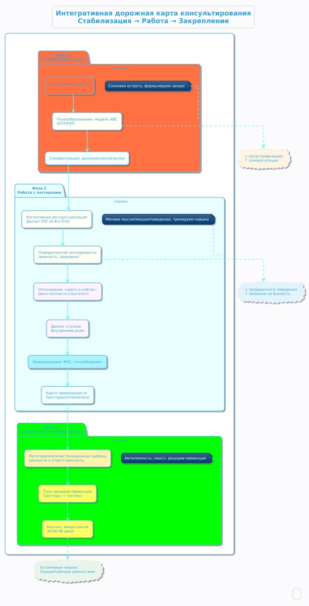 Такой подход может позволить объединить лучшие инструменты из разных школ (КПТ, психодрама, символдрама, телесно-ориентированная терапия, EMDR, коучинг и др.) в четкую последовательность действий: от диагностики до закрепления результата.