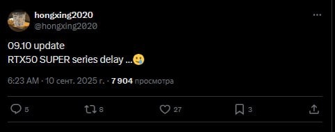 Инсайдер Hongxing2020 сообщает, что выпуск GeForce RTX 50 SUPER «задерживается». Ранее инсайдер MLID называл четвёртый квартал 2025 года ориентировочной датой релиза всей линейки.