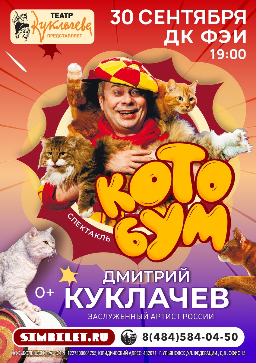 🐱30 сентября в 19:00 в ДК ФЭИ в Обнинске театр Куклачёва приглашает на добрую сказку «Кото Бум