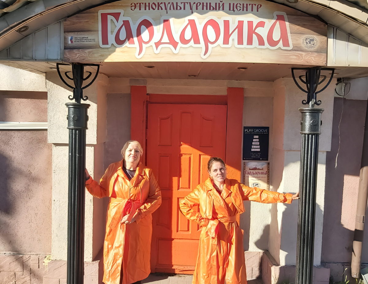 Оранжевая дверь Гардарики, словно портал в иное измерение, мерцала под полуденным солнцем улицы Суворова. Необычный цвет, выбранный с какой-то особой, внутренней логикой, всегда привлекал внимание, но сегодня он стал эпицентром настоящего зрелища. Евгения Пискунова, руководитель этнокультурного центра «Гардарика», и Анна Минеева, режиссер, облаченные в ярко-оранжевые плащи, разыгрывали сцену, которая могла бы показаться сюрреалистичной любому случайному прохожему. Евгения, с гордо поднятой головой и взглядом, устремленным куда-то за пределы видимого, играла роль венерианки. Ее плащ, развеваясь, подчеркивал грацию движений, а в руках она держала нечто, напоминающее древний артефакт, но с явными футуристическими элементами. Анна, напротив, была более подвижна, ее движения были полны любопытства и легкой настороженности, словно она впервые ступала на эту загадочную планету. Ее оранжевый плащ тоже был частью образа, но в нем чувствовалась энергия исследователя, готового к любым открытиям.