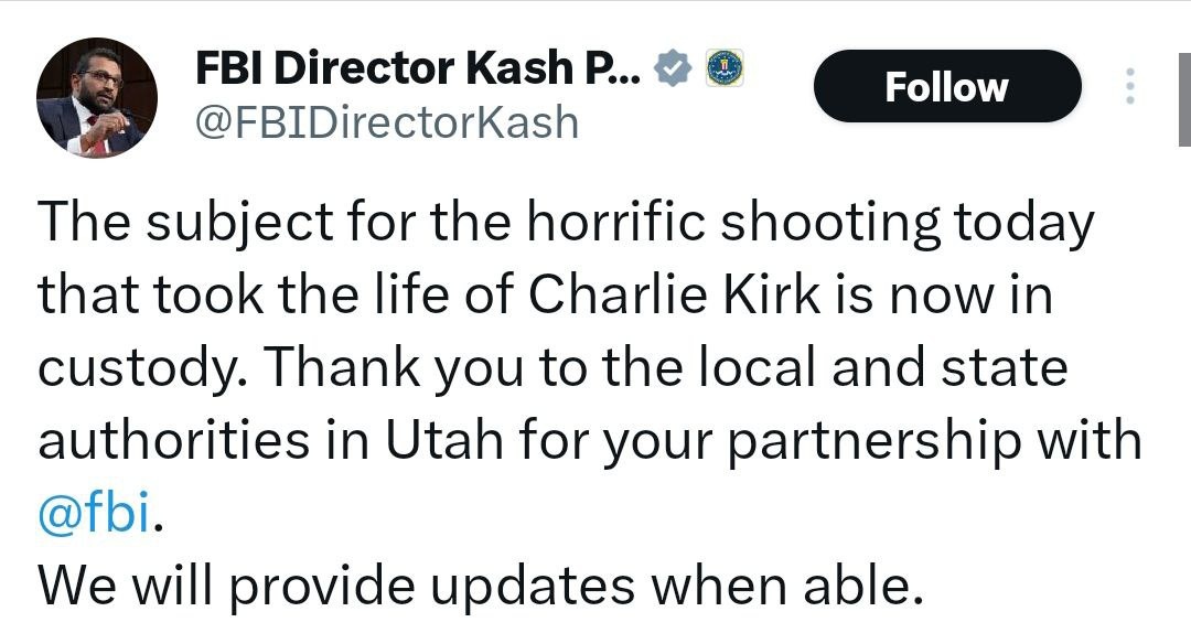 FBI: Charlie Kirk assassin suspect IN CUSTODY Promises updates 'when able'