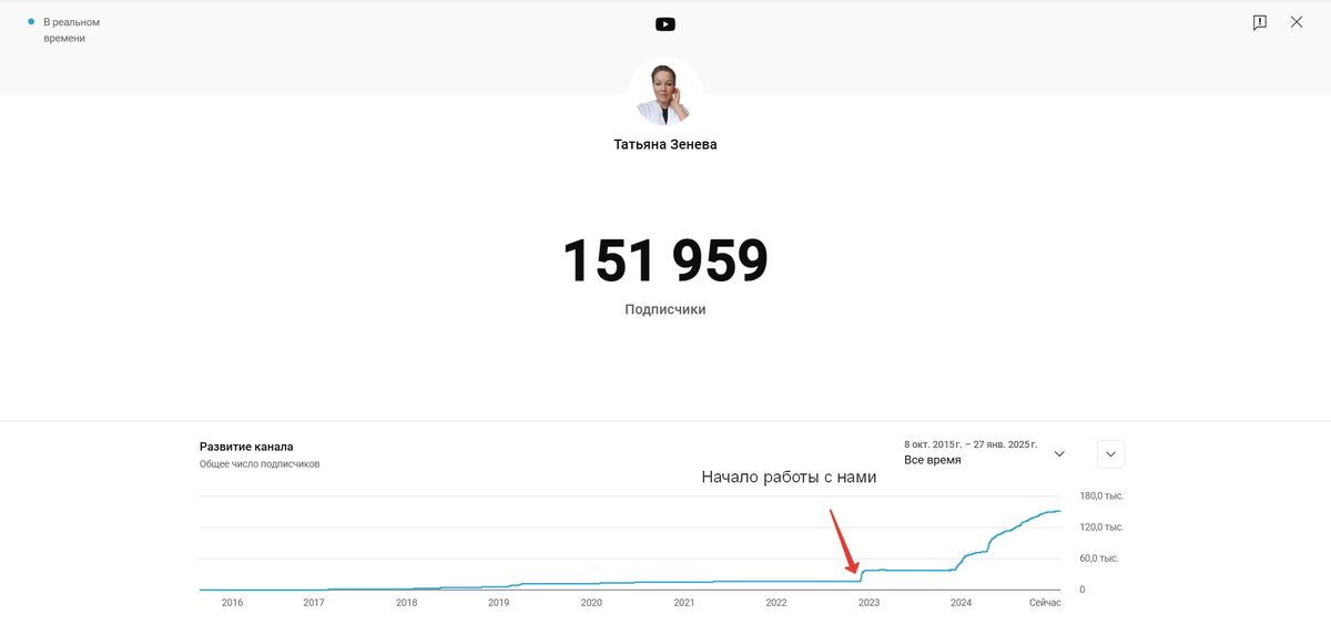 В итоге Татьяна не получала удовольствия от своего канала: ни просмотров, ни подписчиков, ни продаж, а только хейтеры. Автор канала поняла, что все-таки этот подход введения YouTube ей не подходит. В ноябре 2023 мы начинаем сотрудничество.