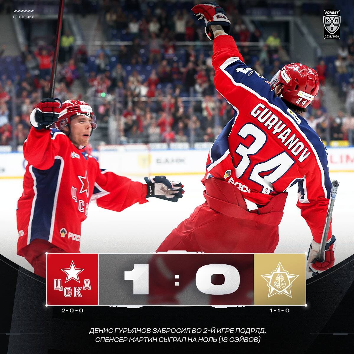 🐴 Гол Гурьянова и первый «сухарь» Мартина в КХЛ принесли ЦСКА 11-ю подряд домашнюю победу над «Адмиралом»! #ФонбетКХЛ