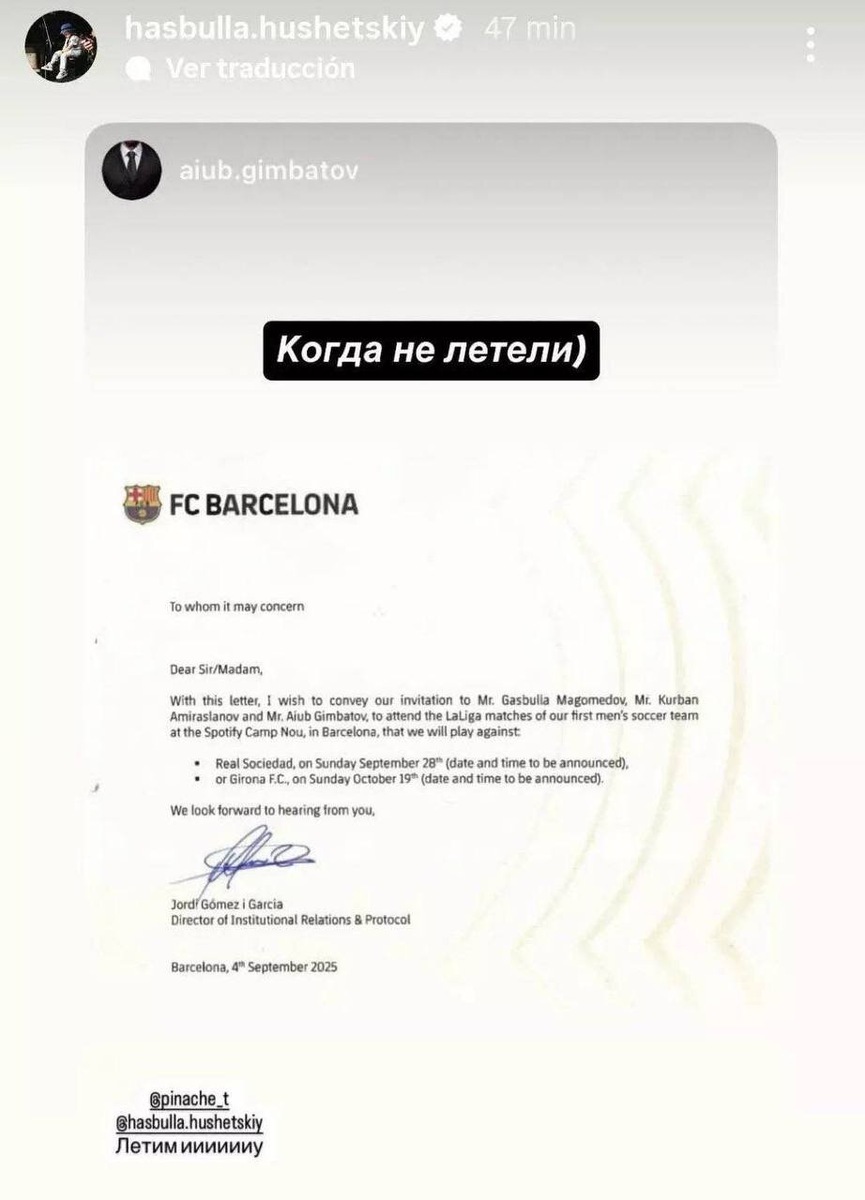 «Хочу передать наше приглашение господину Хасбулле Магомедову, господину Курбану Амирасланову и господину Айюбу Гимбатову посетить матчи Ла Лиги с участием нашей мужской футбольной команды на «Спотифай Камп Ноу», – говорится в письме.