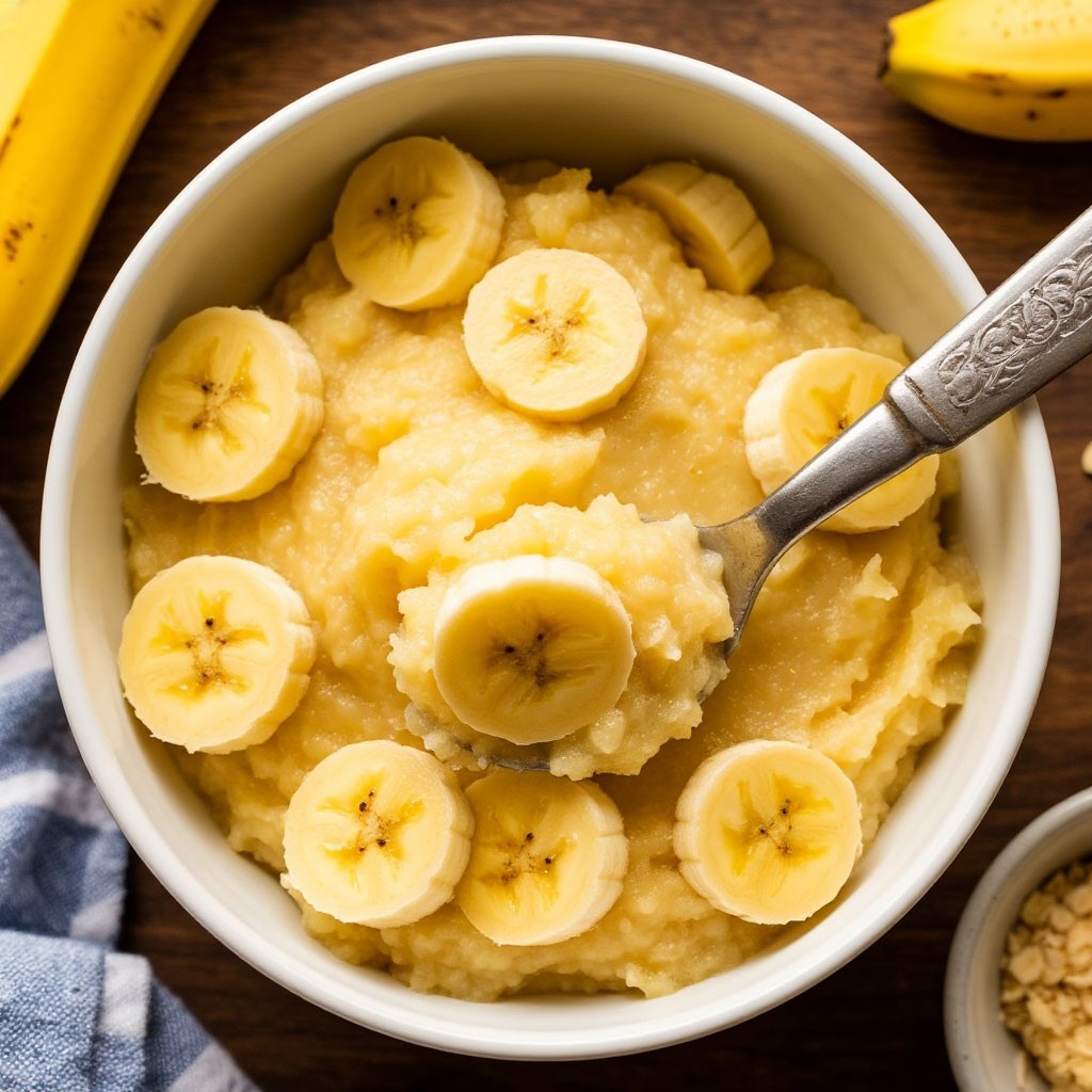 2. Разомните бананы. В большой миске разомните бананы вилкой до пюреобразного состояния. Они должны быть очень спелыми — с коричневыми пятнами для максимальной сладости. Лайфхак: Если бананы не переспели, запеките их в духовке при 180°C 10 минут — так они станут мягче и ароматнее, без лишних усилий! 🍌