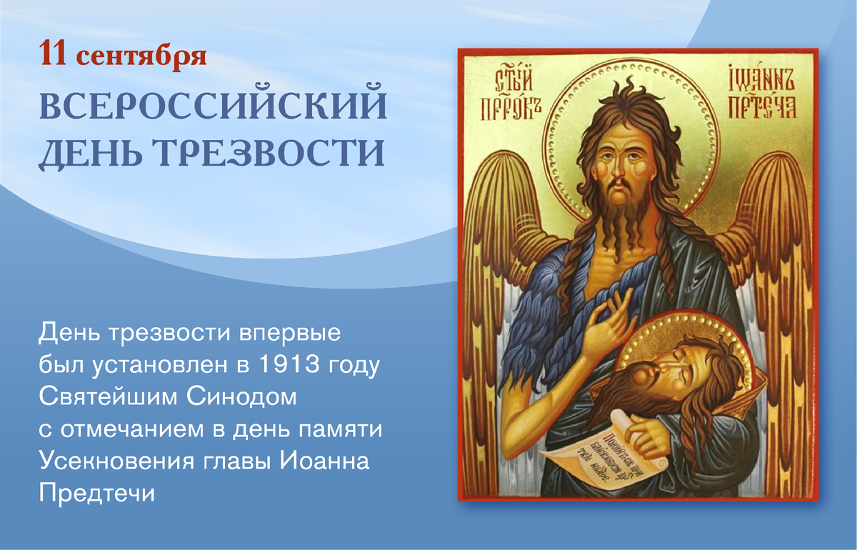 Друзья, и вот о чем еще хочется напомнить вам в день памяти Усекновения главы Иоанна Предтечи — о трезвости и об умеренности. Всё чрезмерное ведёт к падению, страсти рождают духовную слепоту и злодеяния. Ведь смотрите, царь Ирод признавал, что Иоанн — пророк, но страсть к удовольствиям затмила его разум. И одним из этих удовольствий было чрезмерное употребление вина, проще говоря, пьянство, которое повлекло за собой страшное деяние: он отдал приказ об убийстве пророка. Именно поэтому, когда в Российской империи в 1913 году встал вопрос о дате для Дня трезвости, выбор пал на день памяти Усекновения главы Иоанна Предтечи. В этот день стали закрывать винные лавки и прекращалась продажа алкогольных напитков. После 1917 года традиция отмечать День трезвости была прервана. Хотя советские лозунги «Трезвость — норма жизни» и «Пьянству — бой» и пытались донести до людей основные правила взаимоотношений с алкоголем. В 2014 году Священный Синод Русской Православной Церкви восстановил ежегодное пр
