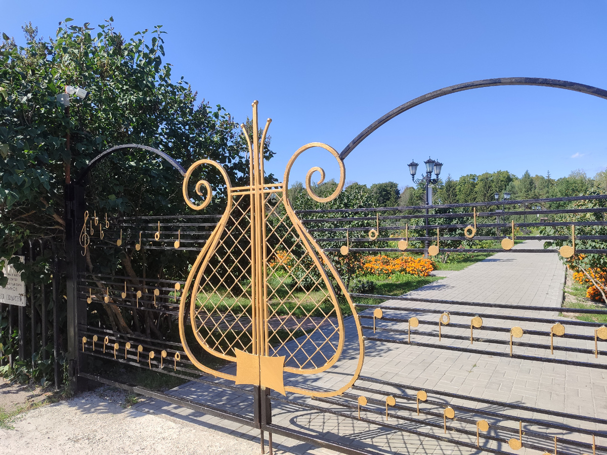 От самого входа на территорию усадьбы нас встречают звуки музыки. Всё говорит о том, что здесь жил и творил пианист, дирижёр и композитор. Даже въездные ворота украшают ноты его романса "Сирень".