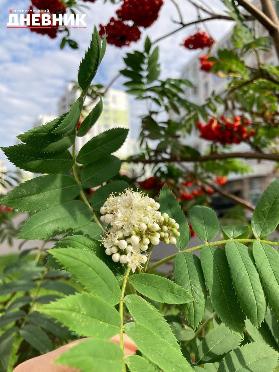 В Северной столице природа удивляет горожан. На фоне сентября, когда деревья готовятся сбрасывать листву, замечена рябина… в цветах. Сбивчивая погода и затянувшееся тепло заставили дерево «решить», что пришла весна.