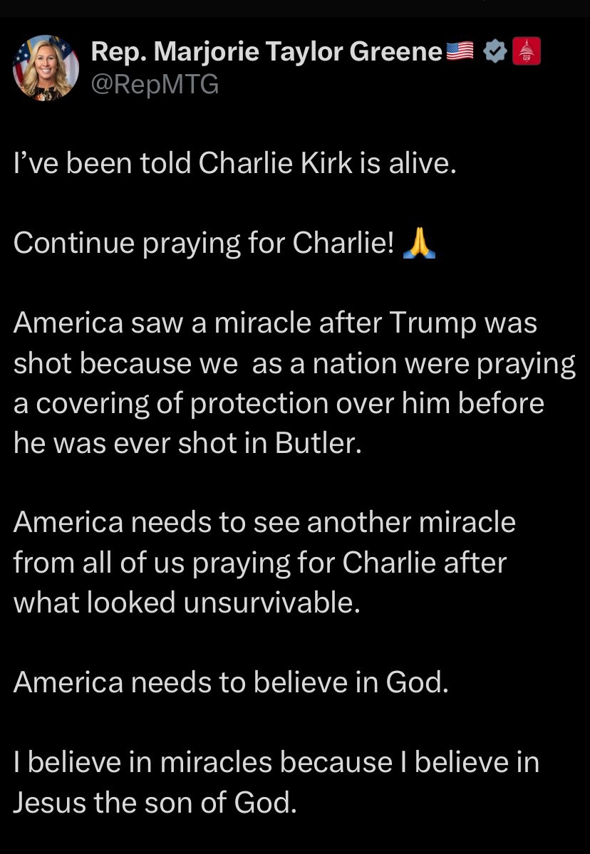‘Kirk is ALIVE’ — MTG Shooting ‘looked unsurvivable’ Adds: ‘America needs to see another MIRACLE’