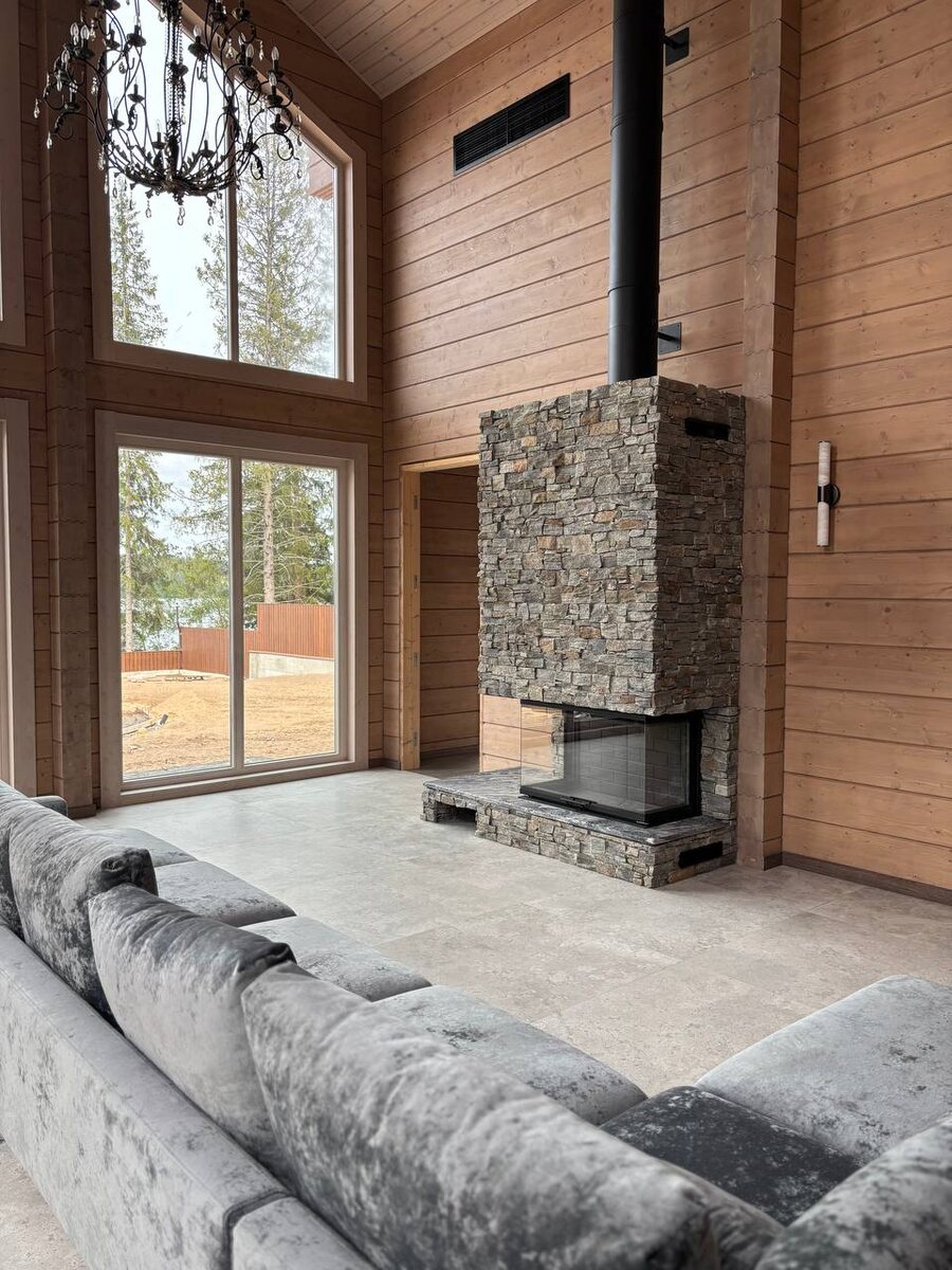 11.06.2025. Ленинградская область. КП Лесная Ривьера. Каминная топка ЭкоКамин Дельта 1000. Каминная топка и дымоход уже были установлены. Мы склеили термокороб👌. Смонтировали сварной металлокаркас👌. И завершили все отделкой натуральным камнем👌. Всем добра❤️.