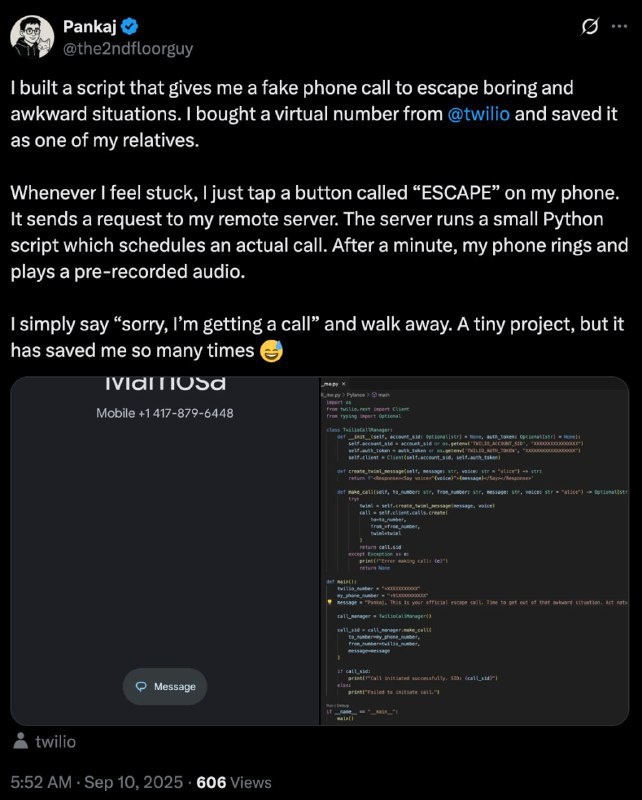 Как только он чувствует дискомфорт в общении, запускает приложение. Вскоре бот инициирует звонок с реального номера, и он уходит, чтобы "поговорить".
