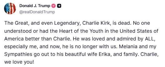 Трамп сообщил о смерти Чарли Кирка.