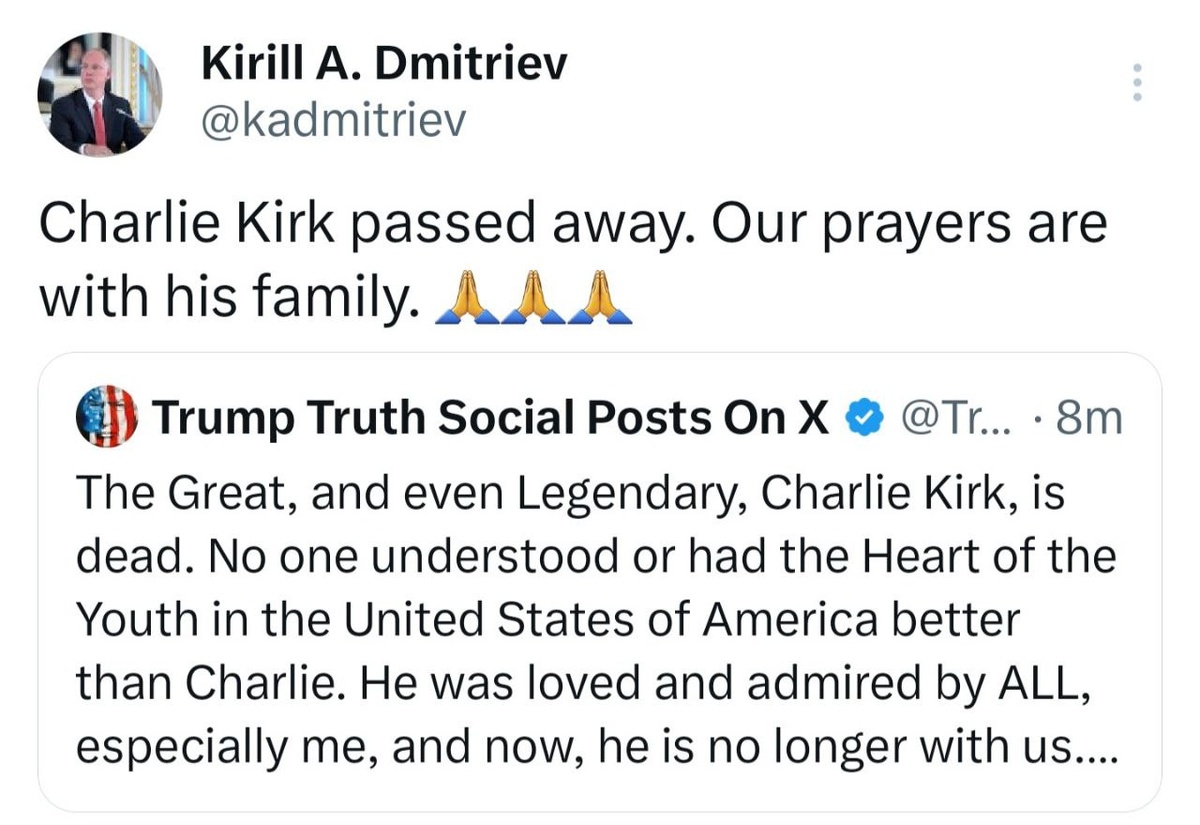 Putin's special envoy Dmitriev: PRAYERS to Charlie Kirk's family after 31yo ASSASSINATED