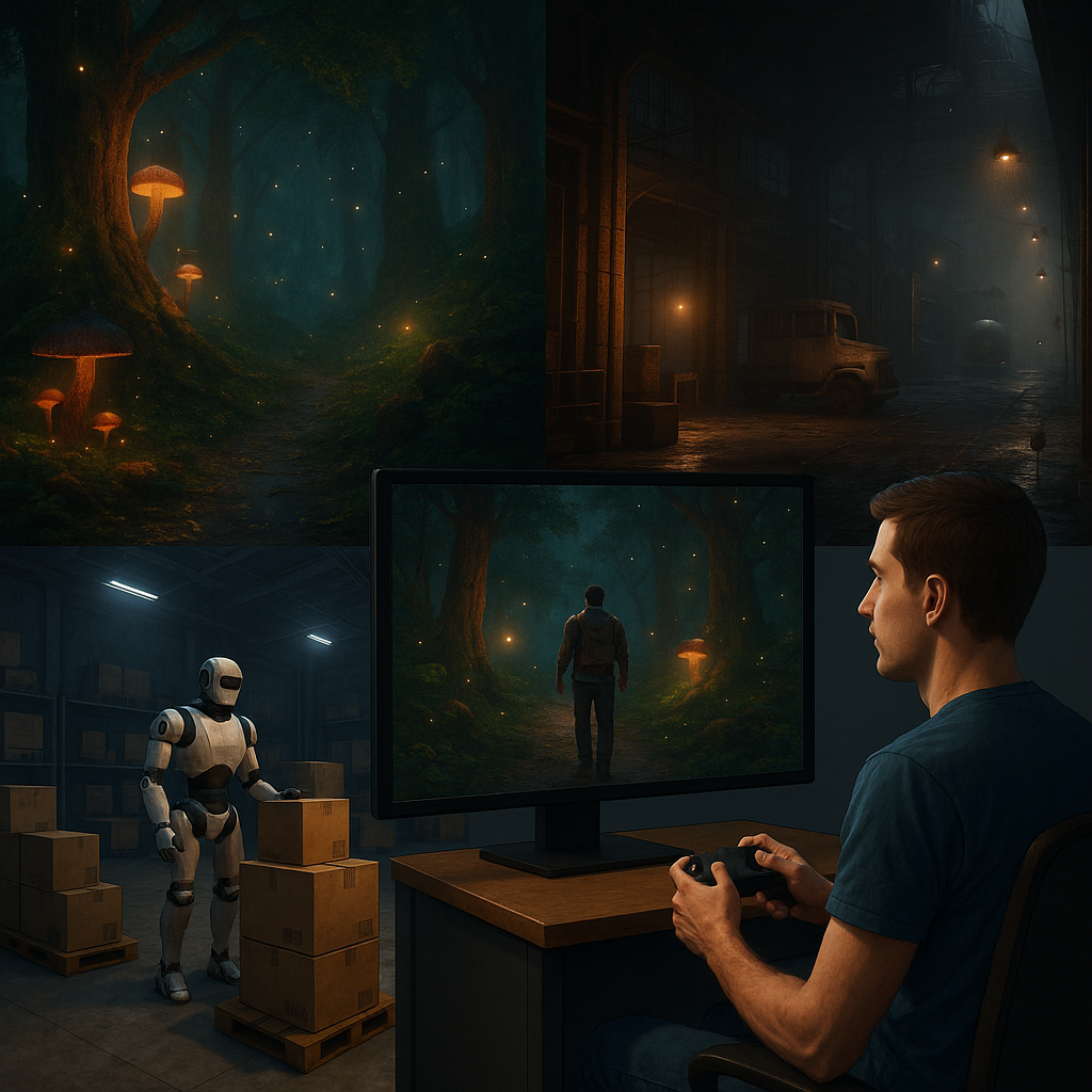 3. Робот-тренировка — в виртуальном складе генерируется реалистичное пространство, где робот-агент отрабатывает движение коробки. Genie 3 позволяет добавить препятствия, изменить освещение, а агент учится ориентироваться. Все изменения сохраняются, а комната становится настоящей лабораторией виртуальной робототехники.