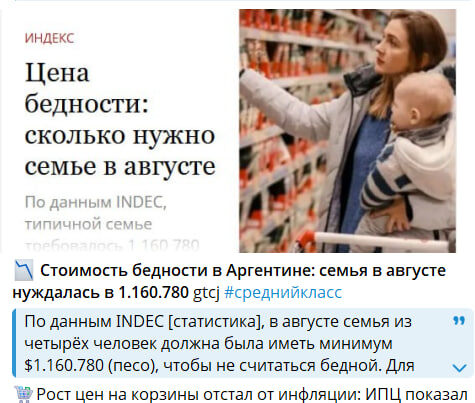 📉 Стоимость бедности в Аргентине: семья в августе нуждалась в 1.160.780 пемо #среднийкласс По данным INDEC [статистика], в августе семья из четырёх человек должна была иметь минимум $1.160.780 (песо), чтобы не считаться бедной. Для преодоления черты крайней нищеты требовалось \$520.529. Базовая продуктовая корзина (CBA) и общая корзина (CBT) выросли на 1% за месяц и на 23,5% за год. Дом из трёх человек нуждался в 924.116, а из пяти — \$1.220.885 песо. 🛒Рост цен на корзины отстал от инфляции: ИПЦ показал +1,9% в августе и +33,6% за год. То есть продукты и услуги дорожают медленнее, но бедность остаётся “дешевле только статистически”