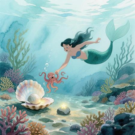 Гнев русалочки мгновенно сменился жалостью. Используя Ракушку, Мариэла успокоила малыша. Она пообещала, что не оставит его и найдёт ему новый, самый лучший и безопасный дом. В ответ осьминожка доверчиво обвил её руку крошечными щупальцами.
