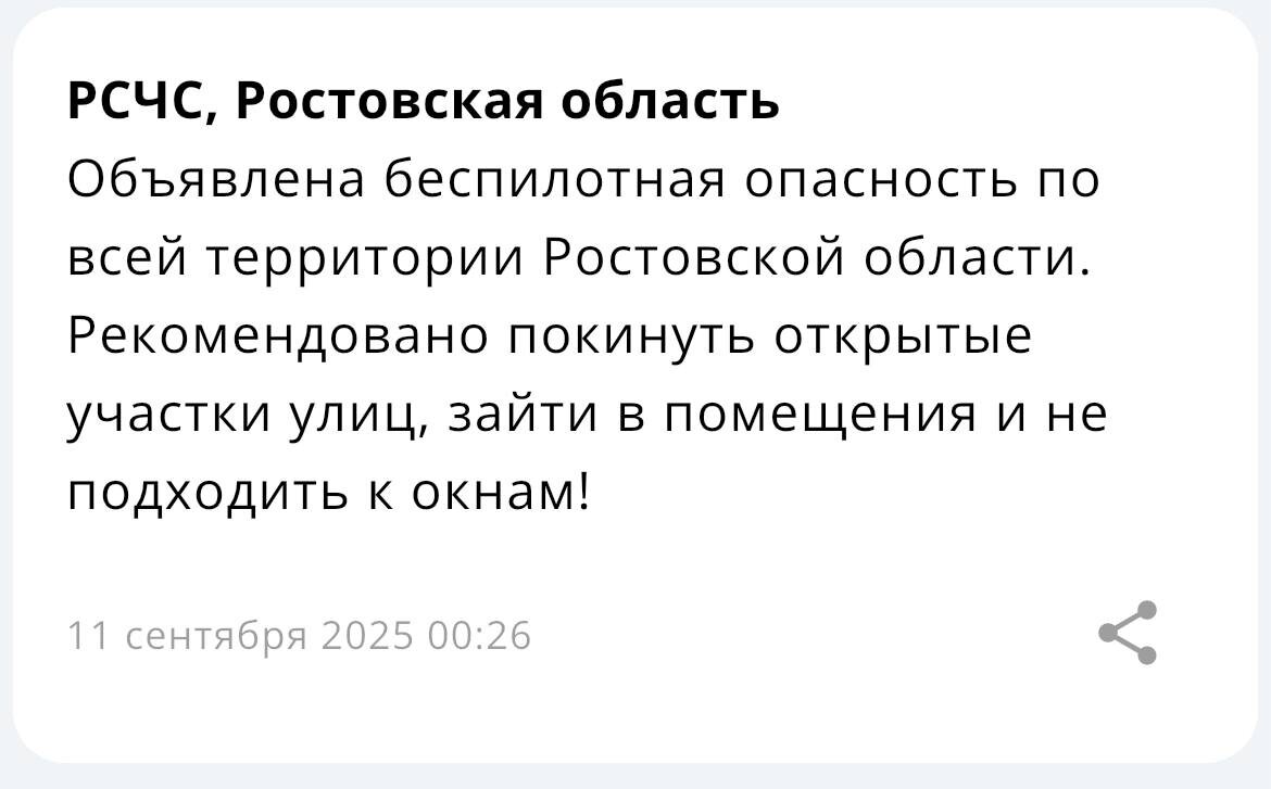 ‼️ Экстренная информация РСЧС: Объявлена беспилотная опасность по всей территории Ростовской области.