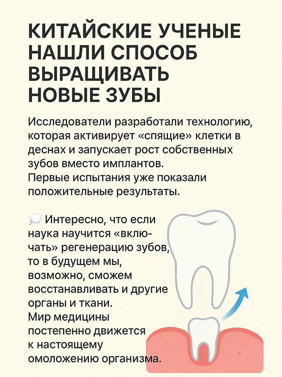 🦷 Китайские ученые сделали прорыв в стоматологии — они нашли способ выращивать новые зубы! Исследователи разработали технологию, которая активирует «спящие» клетки в деснах и запускает рост собственных зубов вместо имплантов. Первые испытания уже показали положительные результаты. Это открытие может перевернуть стоматологию и избавить миллионы людей от протезов и имплантации. 💭 Интересно, что если наука научится «включать» регенерацию зубов, то в будущем мы, возможно, сможем восстанавливать и другие органы и ткани. Мир медицины постепенно движется к настоящему омоложению организма. #новости #наука #стоматология #зубы #здоровье #технологии #будущеемедицины #регенерация #китайскиеуученые #биотехнологии
