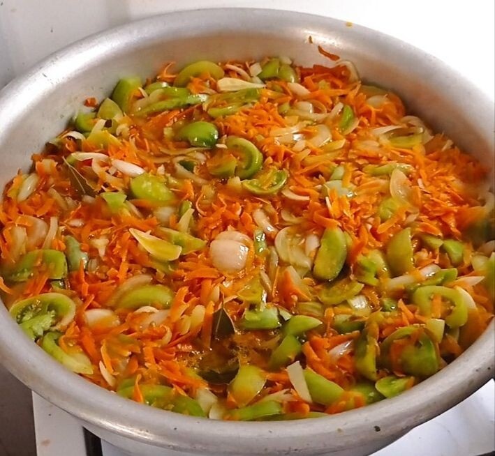Под занавес овощных заготовок (а я надеюсь, что он всё-таки будет, этот занавес!) мы всегда делаем вот этот вкуснейший салатик. Когда зимой Петрович собирается полезть в погреб и спрашивает, что достать, я первым делом заказываю "зелёный", а потом и все остальные. Листок с рецептом был так залюблен нами за долгие годы, что буквы едва читались. Слава богу, он дождался, что его перепечатали и вставили в файлы вместе с другими любимыми, но неухоженными. Часто любимые у плохих хозяек ходят неухоженные, увы. Но такие уж мы, замотанные трудовой жизнью девочки. Эта отговорка, конечно, слабая, и нет нам оправдания.😉 Когда кушаю эту вкусняшку, вспоминаю друзей-кубинцев, с которыми жила в общежитии. Когда-то писала уже, что они покупали только зелёные помидоры (а их в Волгограде на рынке специально для них с мая и до самой зимы продавали) и удивлялись, как можно есть красные? Это же невкусно! 😂😂😂 Итак, рецепт в студию! 3 кг зелёных помидоров порезать дольками, 1,5 кг моркови на тёрке, 1
