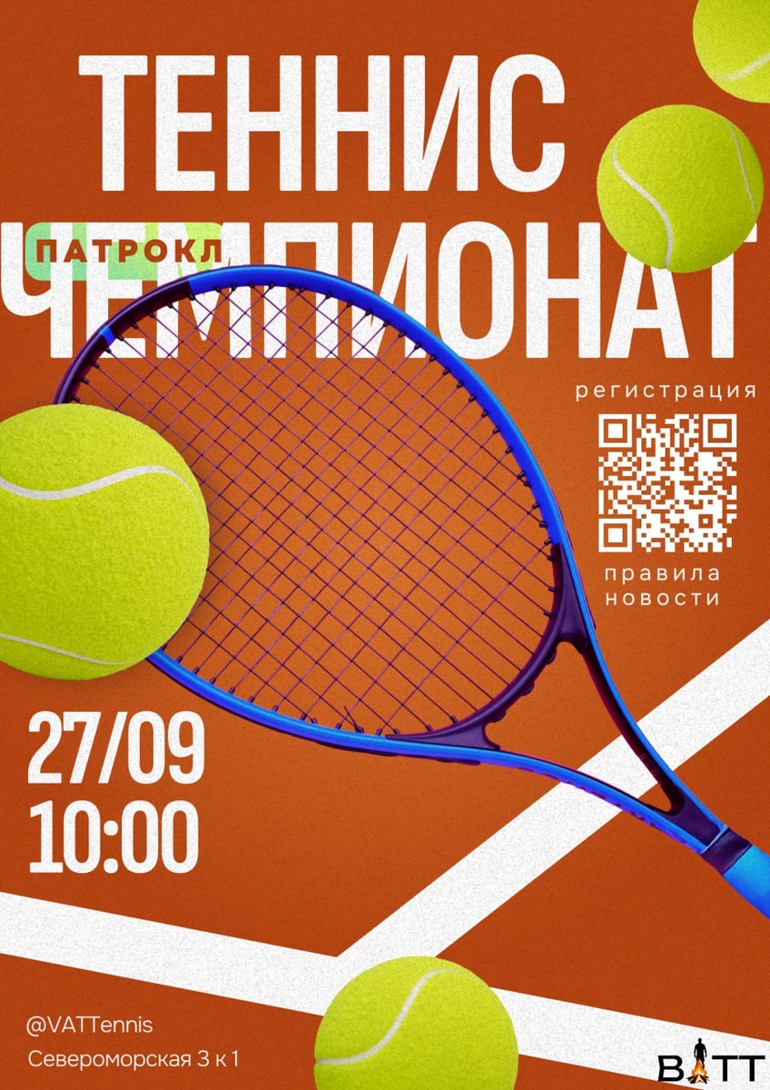 🔥 Теннисный турнир — Патрокл-Теннис Торнамент! 🎾 📍 Североморская 1, волейбольная площадка 🗓 Дата: 27.09.25 ⏰ 09:00 - регистрация. 🎾 10:00 - Первая игра 👕 Формат игры: 1 сэт, одиночный. 💥 Категории турнира 👨🏼🦰 Мужчины 👩🏼 Женщины Регистрация обязательна Положение Ждём всех любителей тенниса на захватывающий спортивный праздник! Приглашаем местный бизнес к партнерству @VATTennis