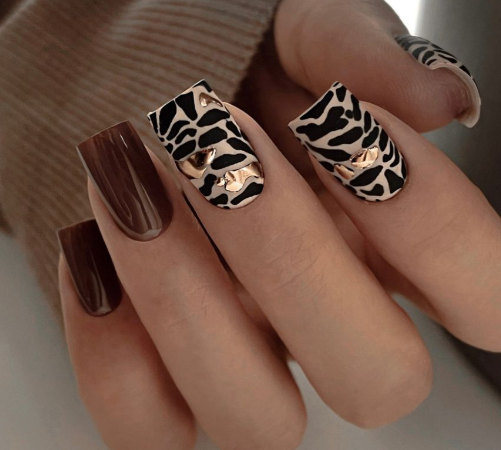Анималистические мотивы продолжают удерживать лидерство среди трендов осеннего маникюра. Наряду с традиционным леопардовым рисунком, популярностью пользуются и более сдержанные вариации, такие как «черепаший панцирь» и «тигровая полоска». Такой принт можно использовать выборочно, подчеркнув отдельные пальцы, или же покрыть всю поверхность ногтя, дополнив классическими осенними оттенками лака, такими как шоколадный, морковный или песочный.