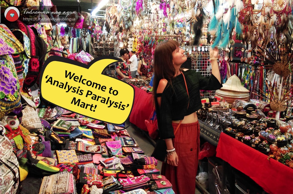 — Что взять на завтрак: омлет, сырники или овсянку? Или, может, ничего не брать, а просто выпить кофе? На этом моменте в игру вступает паралич выбора. По-английски - это choice paralysis или analysis paralysis. Так можно описать ситуацию, когда человек стоит перед горой вариантов и… зависает словно браузер, в котором открыто 128 вкладок со словарями, полезными сайтами и мемами про продуктивность. И вроде плохо, когда нет выбора. Но, когда выбор есть, может быть ещё хуже! Первым термин analysis paralysis стал использовать американский журналист Чарльз М. Шварц ещё в середине XX в., но идея витала в умах задолго до него. Возьмём, например, буриданова осла, который так долго выбирал между двумя стогами сена, что остался голоден. Чем опасен паралич выбора? Всё просто: слишком много опций — и даже шоколадка перестаёт радовать, ведь постоянно кажется, что другая точно лучше. У меня так всегда бывает в ресторане. Долго выбираю, а потом блюдо или напиток мужа всё равно оказывается вкуснее.
