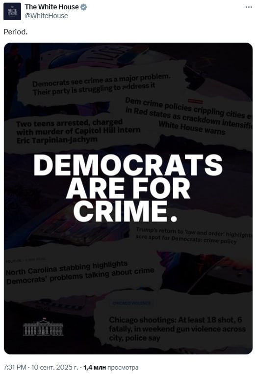Белый дом обвинил Демпартию и ее сторонников в поддержке преступности Публикация с надписью "Демократы за преступность" появилась в аккаунте Х. Катализатором обвинений стало убийство сторонника Трампа Чарли Кирка и зверское нападение на украинскую беженку Ирину Заруцкую. @SPUTNIKBY