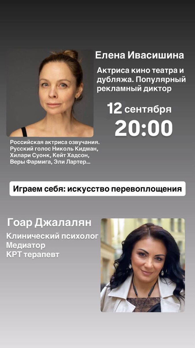 Доброе утро☀️ Дорогие подписчики, сегодня хочу еще раз поближе познакомить вас с удивительной женщиной — Еленой Ивасишиной. Она актриса театра и кино, и именно её голосом на русском языке говорят многие голливудские звёзды: Николь Кидман, Кейт Хадсон, Хилари Суонк. А ещё её можно услышать в «Ведьмаке», «Dreamfall» и «Mirror's Edge». Елена — актриса дубляжа, человек, который умеет тонко проживать эмоции и перевоплощаться в самых разных героинь. Именно поэтому я пригласила её в эфир: ведь тема ролей и масок — это и про актёрскую профессию, и про нас с вами. 📅 12 сентября ⏰ В 20:00 В прямом эфире, мы поговорим о том: — Когда наши роли помогают, а когда мешают — как отличать себя настоящего от маски — Где грань между «я настоящая(ий)» и «я в роли» — Как быть собой, даже если вокруг «спектакль» — и зачем каждому из нас нужно искусство перевоплощения Приглашаю вас присоединиться и, конечно, вы сможете задать свои вопросы Елене прямо в эфире. Эфир пройдет уже завтра на нашем канал