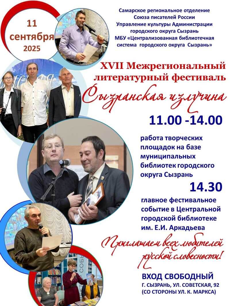 Традиционно в сентябре в рамках празднования дня города в Сызрани проходит литературный фестиваль «Сызранская излучина», главными гостями которого становятся писатели Самарской области и других российских регионов. В 2025 году фестиваль будет проходить в семнадцатый раз. Первый такой литературный форум состоялся в год 325-летия Сызрани (2008). С тех пор сложилась добрая традиция посвящать дню рождения Сызрани праздники русской словесности. В фестивале в онлайн формате принимают участие белорусские коллеги из города-побратима Бобруйска. Свое творчество они представят и в 2025 году. Также гостями фестиваля станут писатели из городов: Самара, Новокуйбышевск, Жигулевск, Чапаевск, Октябрьск, Ульяновск. Фестиваль посетит председатель Самарской областной писательской организации Громов А.В. На фестивале писатели обменяются опытом, расскажут о ярких творческих событиях, поделятся своими планами.