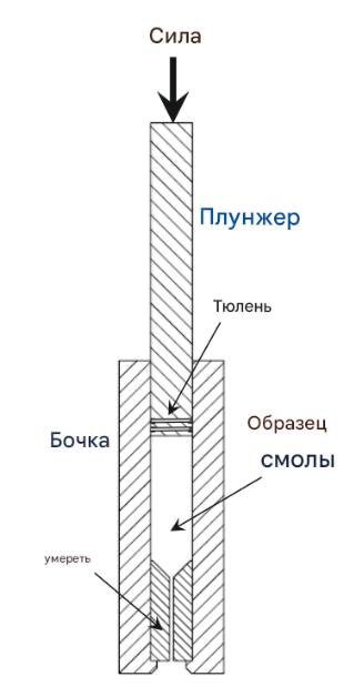 В типичном эксперименте с капиллярным реометром полимерные гранулы загружаются в нагреваемый цилиндр, выдерживаются для достижения равномерной температуры, а затем продавливаются через капилляр плунжером с постоянной скоростью. Датчик силы измеряет давление на границе раздела полимера и плунжера.