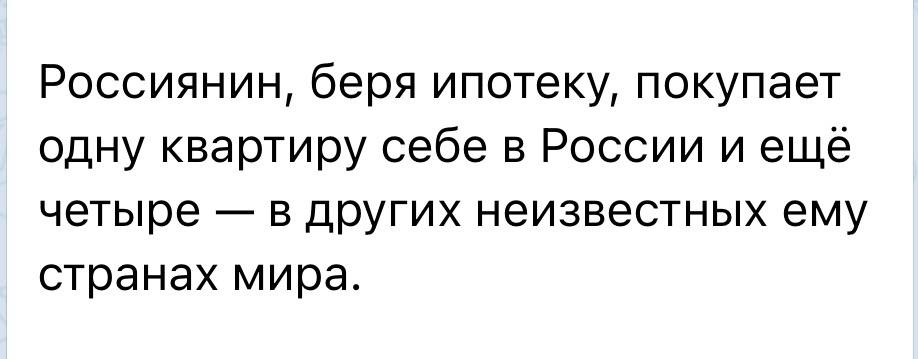 Да, такие условия ипотеки как в России это позор, причем, не для наших банкиров, а для нашего государства. Но никто от позора не краснеет, никто не чувствует никакой вины и не ощущает никакого неудобства. В сети шутят И в этой шутке есть доля шутки. Все же знают, что за 30 лет получается в лучшем случае оплата за 2 квартиры. В худшем и правда - 3, а то и 4. Пусть не всегда равноценных, но тем не менее. Задумайтесь над двумя моментами: 30 лет - первый. 3 квартиры - второй. Знаете о чем это говорит? ОБ УРОВНЕ ЖИЗНИ и об уровне на котором находится наше население в основной массе! Да, это показатель социального уровня населения. Такие кредиты в 20-30% это позор для нашей страны! Точнее, не так. Это был бы позор если бы не чьи-то интересы в том чтобы так поддерживать банки. Посмотрите на статистику наших банков - сотни и сотни миллиардов чистой прибыли. С чего бы вдруг? Где еще у банков такие доходы??? Наш любимый ЦБ это отдельная песня. То разбазарят 300 миллиардов долларов по Европе и