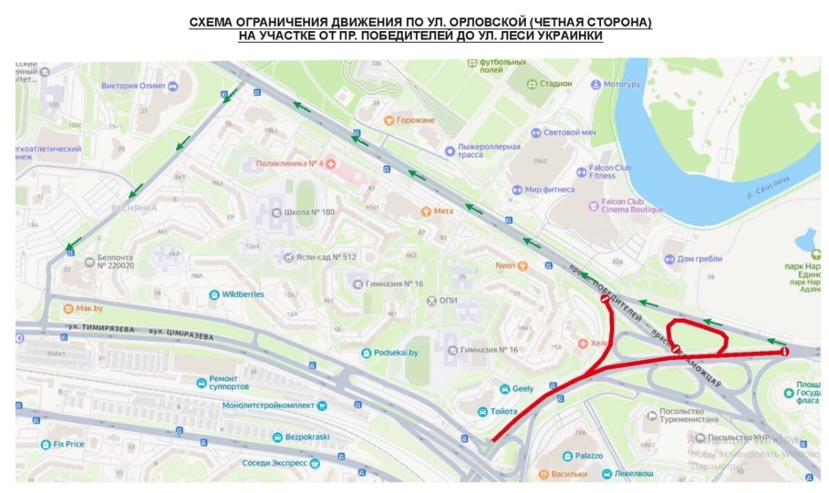 В связи с производством работ по замене асфальтобетонного покрытия на Орловской улице введут полное ограничение движения транспортных средств. Схема: УГАИ ГУВД Мингорисполкома С 21:00 11 сентября до 05:20 12 сентября запрет будет действовать на чётной стороне данной улицы — на участке от съезда на чётную сторону проспекта Победителей до съезда на улицу Леси Украинки, а также на подъёмах с проспекта Победителей на чётную сторону улицы Орловской. Ранее, с 21:00 10 сентября до 05:20 11 сентября, движение ограничивали на нечётной стороне. Госавтоинспекция просит участников дорожного движения учитывать данную информацию при выборе маршрута в указанные дни. Заглавное фото носит иллюстративный характер, архив av.by