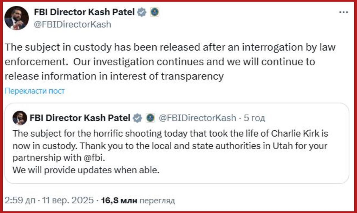 Как сообщил директор Федерального бюро расследований (ФБР) Кэш Патель, задержанного освободили после допроса правоохранительными органами.