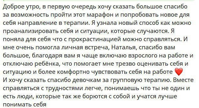 Мы завершили психологический марафон «Проявленность: уверенность, свобода, движение».🔥 За 4 недели участники шаг за шагом проработали внутренние барьеры и я получила от них очень тёплые отзывы ❤️ А я собрала весь этот путь в закрытый Telegram-канал — в формате готового интенсива. Внутри всё разложено по полочкам: задания идут в психологической логике, одно за другим, чтобы вы безопасно и последовательно прошли 4 ключевые темы: ✔️ работа с детскими страхами и травмами, ✔️ самозванец и внутренний критик, ✔️ прокрастинация и перфекционизм, ✔️ эмоциональное выгорание. Что ждёт внутри канала: - 25 заданий — видео, EMDR-сессии в записи, письменные и когнитивные практики - пошаговое сопровождение в удобном для вас ритме - финальное упражнение для формирования вашего следующего шага 🎁 Плюс бонус — два эфира маркетолога-стратега Ирины Мажейкиной: как системно привлекать клиентов и расти в доходе без хаоса и выгорания. 🔥 Это готовый интенсив, к которому можно возвращаться в любое врем