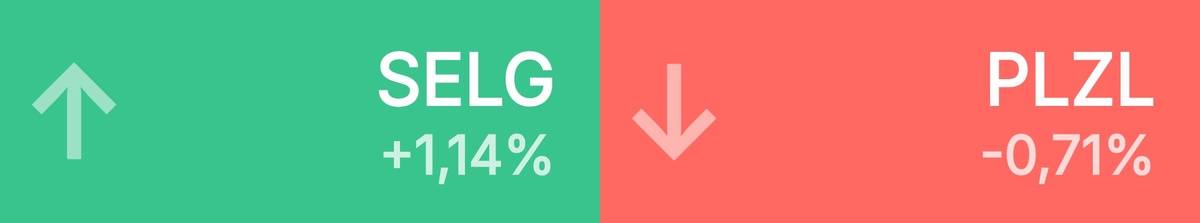 🔺 Топ-10 лидеров роста среди крупнейших акций: Селигдар • 47,81 ₽ • 1,14% Циан • 631 ₽ • 0,93% ЭсЭфАй • 1 236 ₽ • 0,73% Европлан • 624 ₽ • 0,71% Московский • 8,03 ₽ • 0,54% НЛМК • 121 ₽ • 0,43% ТГК-1 • 0,01 ₽ • 0,40% Татнефть • 653 ₽ • 0,37% Лента • 1 830 ₽ • 0,36% Россети • 0,07 ₽ • 0,33% 🔻 Топ-10 лидеров падения среди крупнейших акций: Полюс • 2 320 ₽ • -0,71% Инарктика • 593 ₽ • -0,67% Мечел • 81,85 ₽ • -0,62% Фикс Прайс • 0,76 ₽ • -0,59% Юнипро • 1,67 ₽ • -0,54% Мечел прив • 79,35 ₽ • -0,50% Группа ЛСР • 788 ₽ • -0,48% VK • 325 ₽ • -0,28% Газпром • 130 ₽ • -0,25% РуссНефть • 122 ₽ • -0,25%