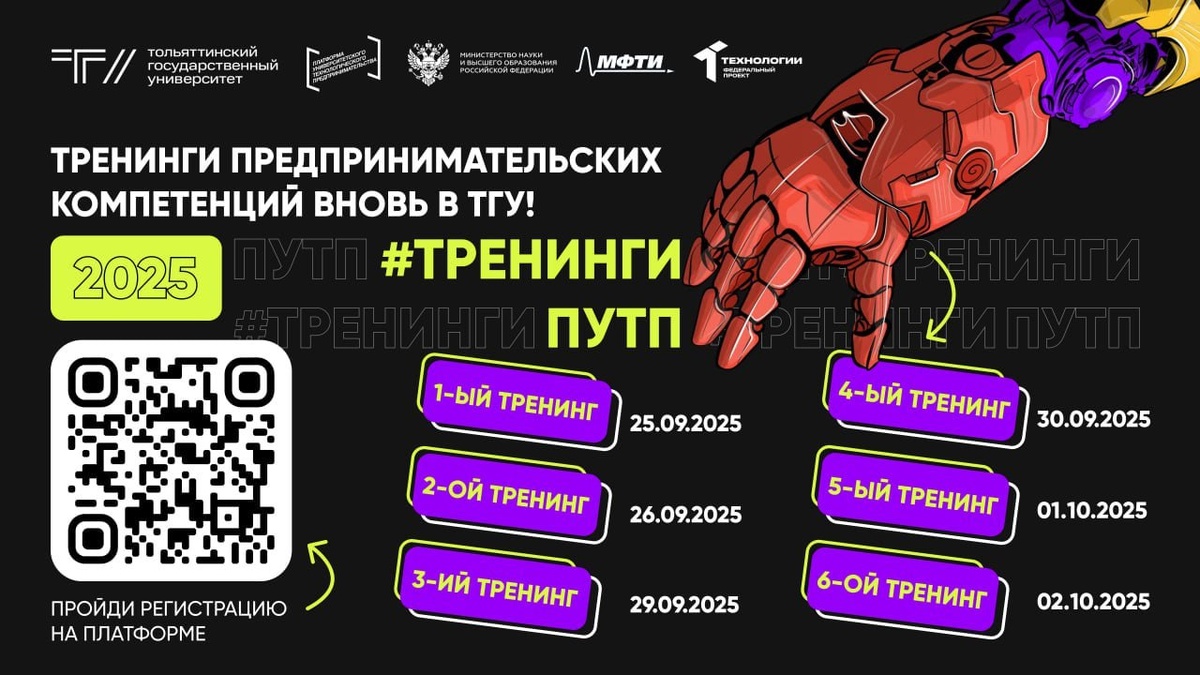 📢 В ТГУ стартует «Навигатор стартапа» За одну неделю студенты ТГУ пройдут все ключевые этапы развития технологического стартапа и прокачают предпринимательские компетенции в игровом формате бизнес-симуляции. Помогать участникам тренингов будут эксперты из Самарского университета. 📆 Тренинги пройдут в ТГУ 25, 26, 29, 30 сентября, 1 и 2 октября 2025 года. 📍 Место проведения: актовый зал ТГУ (ул. Белорусская, 14). Что ждёт студентов на тренингах и как на них попасть, читайте на сайте ТГУ👈 Проект реализуется в рамках «Платформы университетского технологического предпринимательства», которая входит в федеральный проект «Технологии». Оператор тренингов – Московский физико-технический институт.