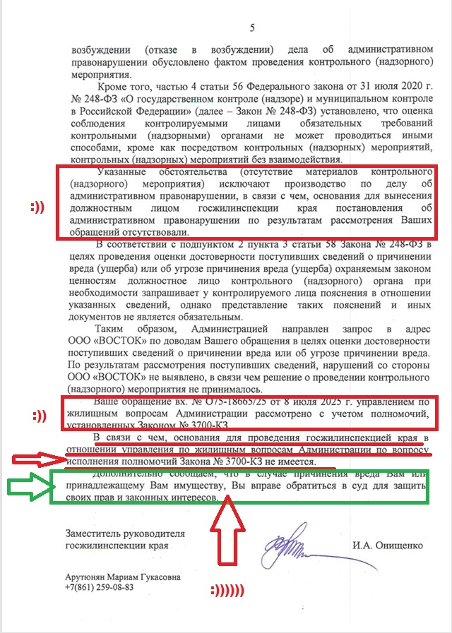 10 сентября 2025 года мною получен ответ заместителя руководителя ГЖИ Краснодарского края Онищенко И.А. от 09.09.2025 № 75-24686/25, который является образцом системного бездействия, формализма и сокрытия нарушений со стороны управляющих компаний и органов жилищного надзора.