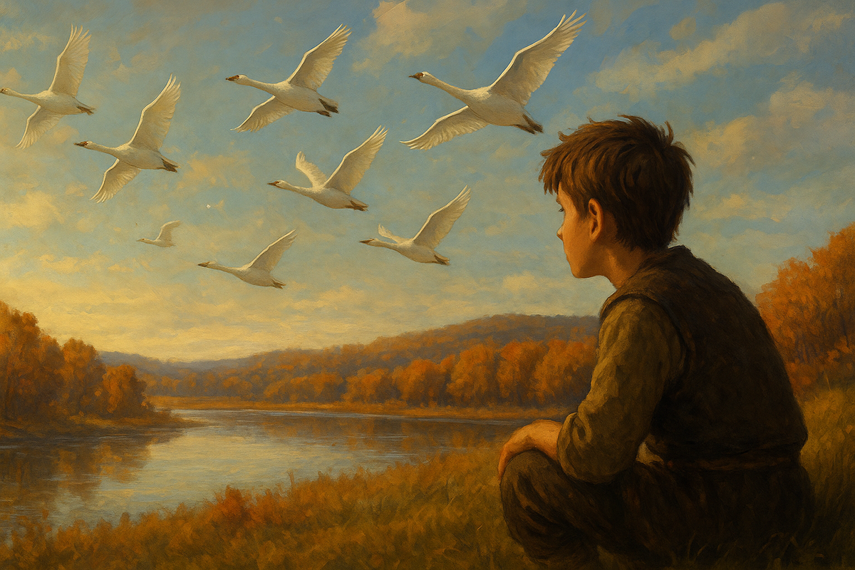 Кайлу сидит у воды и выуживает огромную рыбу, а вокруг него — шумное племя, костры и ощущение простой, но настоящей жизни. В этот момент ещё кажется, что всё будет спокойно, что впереди лишь будни охоты и песен у огня. Но уже на первых страницах намекают: привычный мир начнёт трещать, и мальчику придётся пройти путь, которого он не выбирал, следуя за осенними птицами туда, где кончается детство и начинается взрослая дорога.
