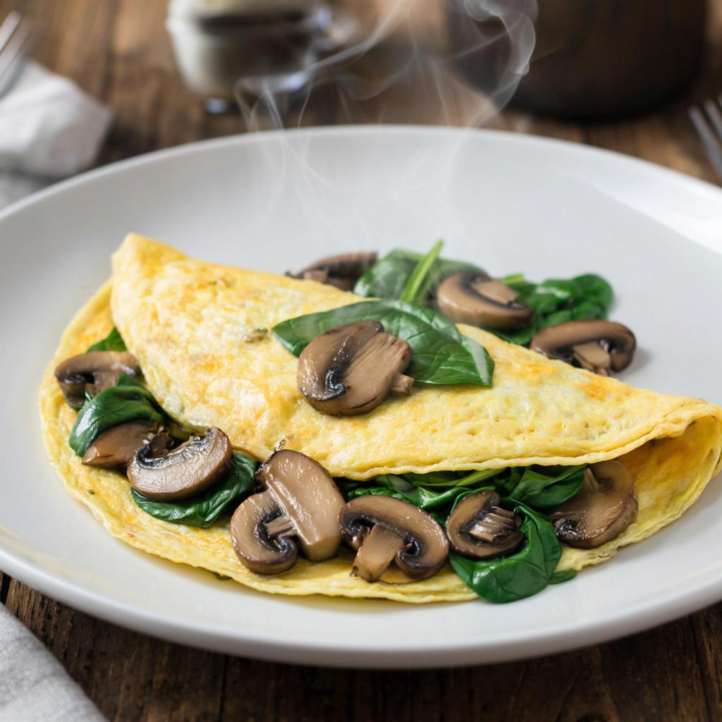 Сегодня приготовим омлет с грибами и шпинатом – блюдо простое, вкусное и полезное одновременно. Этот рецепт идеально подойдет для тех, кто любит завтракать вкусно и полезно. Добавьте немного сыра и зелени, и ваш идеальный утренний омлет готов! ▌ Ингредиенты: - Яйца куриные – 3 шт. - Молоко – 50 мл - Грибы шампиньоны – 150 г - Шпинат свежий – 100 г - Сыр твердый – 50 г - Масло сливочное – 20 г - Соль, перец черный молотый – по вкусу - Зелень свежая (укроп, петрушка) ▌ Шаги приготовления: ▌ Подготовка ингредиентов: 1. Разбейте яйца в миску и добавьте молоко. Взбейте венчиком до однородности. 2. Нарежьте грибы тонкими ломтиками, предварительно промойте и обсушите. 3. Свежий шпинат мелко порубите ножом. 4. Натрите сыр на крупной терке. ▌ Процесс приготовления: 1. Поставьте сковороду на средний огонь и растопите масло. 2. Обжаривайте нарезанные грибы около 5 минут до золотистого цвета. 3. Добавьте рубленый шпинат и продолжайте обжаривать еще пару минут. 4. Посолите и поперчите смесь грибов