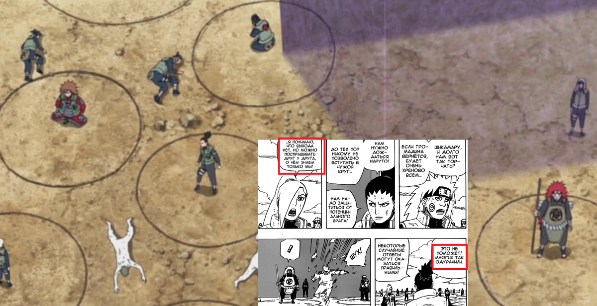 Шикамару ГЕНИЙ, не иначе, ведь только он на своём участке поля боя догадался заставить всех обводить линию вокруг себя, и если кто-то выйдет из круга, то будет мгновенно атакован, и знаете, возможно это не так плохо, ведь у Белого Зетсу действительно нет атак на расстоянии, но с другой стороны - а что ему мешало просто КИНУТЬ КУНАЙ кому-нибудь в голову. Зетсу не так страшно терять своего клона, раскрывшись атакой на реальных людей, как Альянсу потерять реального живого человека, даже если он будет не убит, а критически ранен.