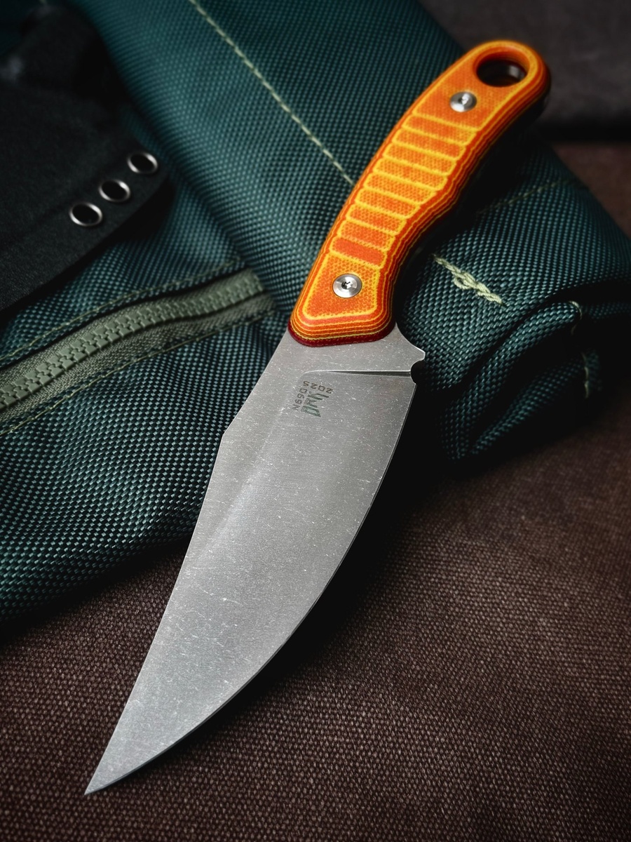 Для ножа использована сталь N690, а на рукояти яркая микарта.