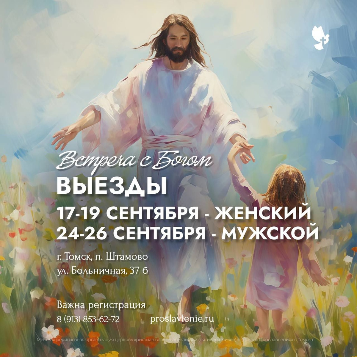 Мы рады пригласить вас на ежегодный трёхдневный выезд «Встреча с Богом». Это уникальная возможность обрести исцеление души, внутреннее освобождение и открыть своё предназначение в Боге. Это погружение в глубину отношений с Создателем и шанс расширить границы своего будущего. Регистрируйтесь уже сейчас! Мы ждём вас на «Встрече с Богом»! - Женский выезд: 17-19 сентября - Мужской выезд: 24-27 сентября Выезды пройдут по адресу г.Томск, п.Штамово, ул. Больничная, 37б. Регистрация по ссылке https://proslavlenie.ru/events/zhenskiy-i-muzhskoy-vyezdy-vstrecha-s-bogom