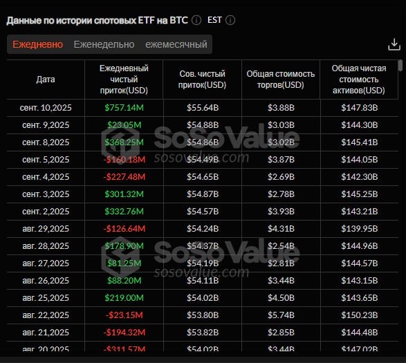 πΈ10 ΡΠ΅Π½ΡΡΠ±ΡΡ ΡΠΏΠΎΡΠΎΠ²ΡΠ΅ Π±ΠΈΡΠΊΠΎΠΈΠ½-ETF Π·Π°ΡΠΈΠΊΡΠΈΡΠΎΠ²Π°Π»ΠΈ ΠΎΠ±ΡΠΈΠΉ ΡΠΈΡΡΡΠΉ ΠΏΡΠΈΡΠΎΠΊ Π² ΡΠ°Π·ΠΌΠ΅ΡΠ΅ $757 ΠΌΠ»Π½, ΡΡΠΎ ΡΡΠ°Π»ΠΎ ΡΡΠ΅ΡΡΠΈΠΌ ΠΏΠΎΠ΄ΡΡΠ΄ Π΄Π½Π΅ΠΌ ΡΠΈΡΡΠΎΠ³ΠΎ ΠΏΡΠΈΡΠΎΠΊΠ°