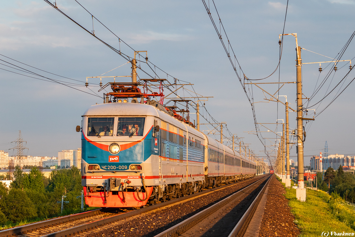 Чс200 - ЧехоСловацкий электровоз, с конструкционной скоростью 200 км/ч. Выпускался в 1974-1980 годах на Skoda. Построено 12 электровозов. Двухсекционный скоростной электровоз, специально разработанный для участка Ленинград (Санкт-Петербург) — Москва. В электровозе установлены двигатели 1AL-4741FLT с часовой мощностью 1050 кВт. Такая мощность позволяет везти составы 12-14 вагонов со скоростью до 200 км/ч. Кузов электровоза сварной конструкции с несущей рамой, опирается на две двухосные тележки с цельнокатанными колёсными парами, при помощи люлечного подвешивания. Секции электровоза соединены жесткой шарнирной сцепкой-балкой с использованием ударно-челюстного механизма. Проектирование электровоза начато в 1969 году, а выпуск состоялся в 1974 и 1979 годах. Данная серия успешно эксплуатировалась на главном ходу между столицами и на других направлениях Октябрьской ж/д до появления электровоза ЭП20 «Олимп». Заводское обозначение: 66E0 — прототип серии 1969 года 66E1 — построенные в желе
