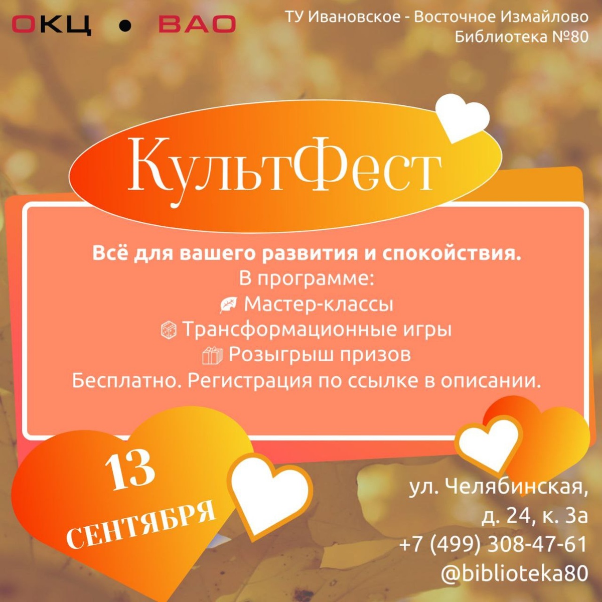 📚 Библиотека №80 приглашает на КультФест 💬 🗓 Уже в эту субботу, 13 сентября, библиотека открывает двери для увлекательного праздника! ✅ Что вас ждёт: - Экскурсии по уникальным уголкам библиотеки. - Авторская игра "Жизненный путь": ведущая Любовь Зайцева проведёт демоверсию своей уникальной трансформационной игры, которая помогает раскрыть внутренний потенциал и избавиться от стресса. - Мастер-классы по искусству, истории Московской кухнии основам рационального питания, по борьбе с тревогой и стрессом. - Семейные активности для маленьких гостей. - Розыгрыш призов среди участников! 📍 Где: Библиотека №80 ГБУ г. Москвы «ОКЦ ВАО» 🕘 Время: с 12:00 до 20:00 🎯 Посетив этот праздник, вы получите уникальный опыт и незабываемые впечатления вместе с близкими людьми! Приходите и узнайте больше о себе и мире вокруг! Подробнее о программе: https://t.me/biblioteka80/1531 https://t.me/biblioteka80/1515 Ведущая авторской трансформационной игры "Жизненный путь" — ваша покорная слуга. #СЛюб